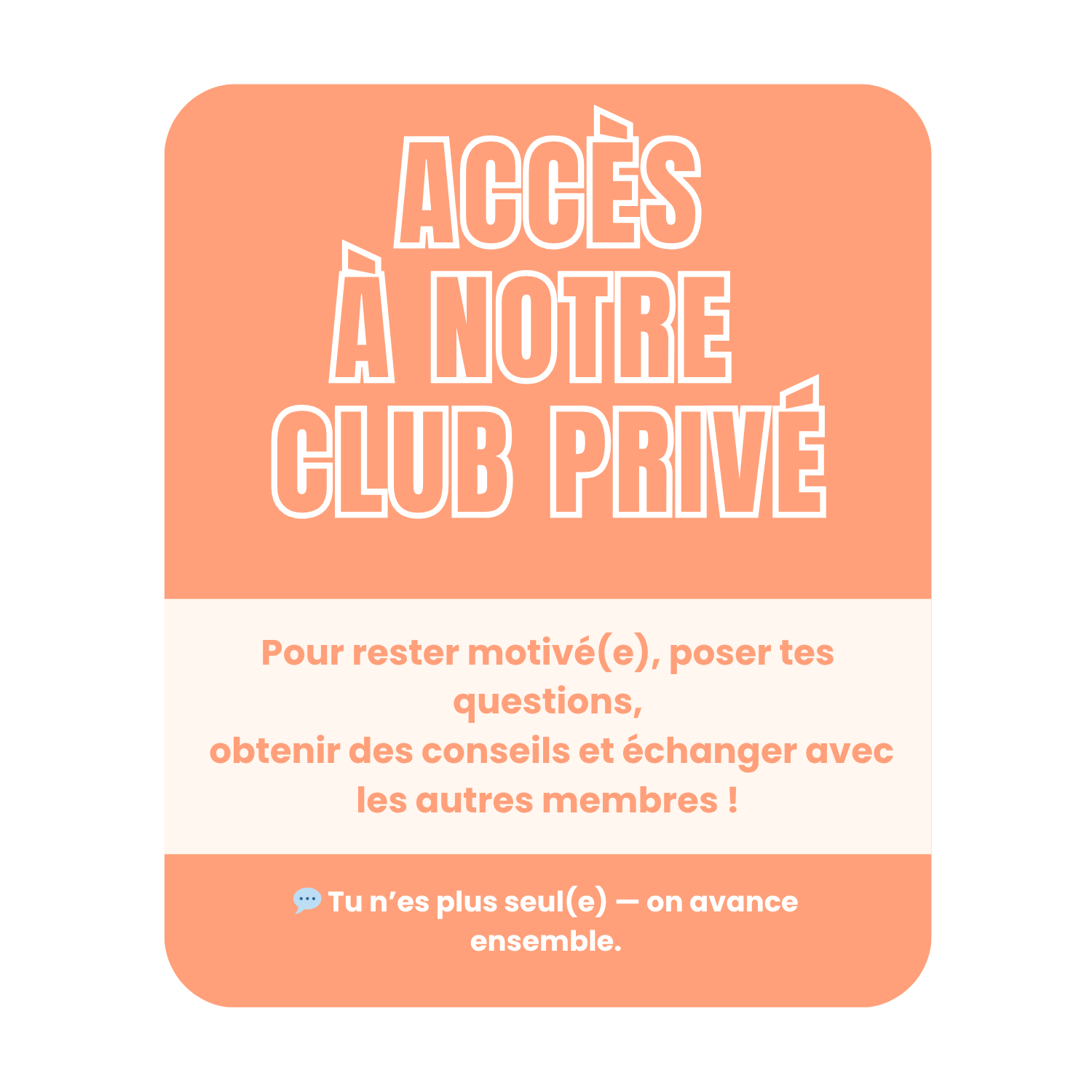 Aucun stress ! Tu suis à ton rythme. Tu peux décaler, rattraper ou supprimer des jours si besoin. Et tu as accès au club privé pour poser toutes tes questions.